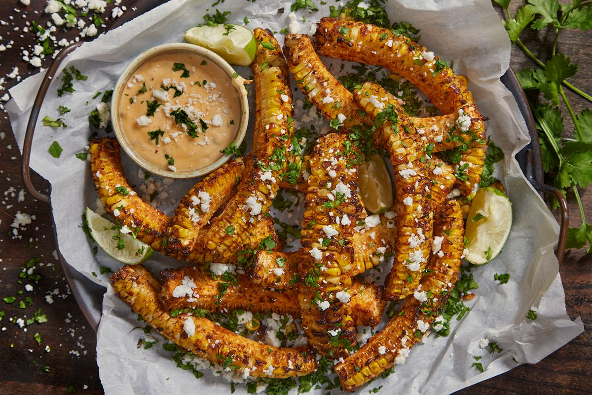 Deliciously seasoned Mexican Street Corn (‘Elote’) air-fried until crispy and topped with delectable, authentic garnishes.