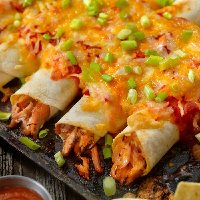 Working with one tortilla at a time, spread about ⅓ cup filling down the center of a tortilla. Roll the tortilla around the filling, then place them snugly side-by-side in the baking dish with the seams down. Spread the remaining ⅔ cup red sauce over one-half of the tortillas (to match the red sauce in the base of the dish), and the remaining green sauce over the other half.