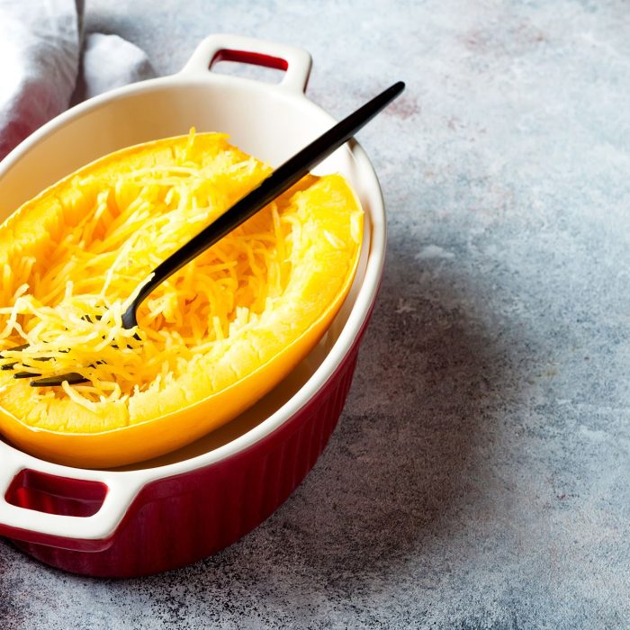 Place the spaghetti squash cut side down on a large baking sheet. Roast until tender, about 35 minutes. Let cool slightly. Using a fork, scrape the inside of the squash to make your spaghetti squash noodles.