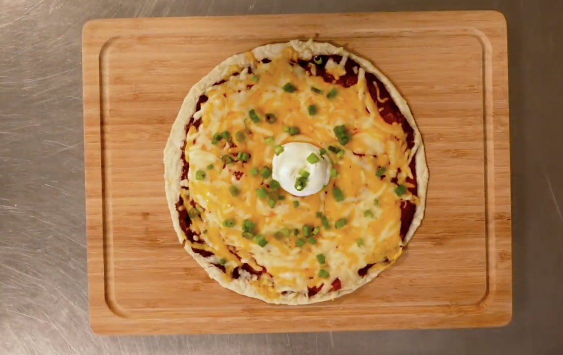 What would you do with a bag of tortillas? Let’s get creative! Make it a pizza! Crispy tortilla, refried beans, Mexican cheese, topped with some sour cream and green onion. Give it a try! It’s super easy.