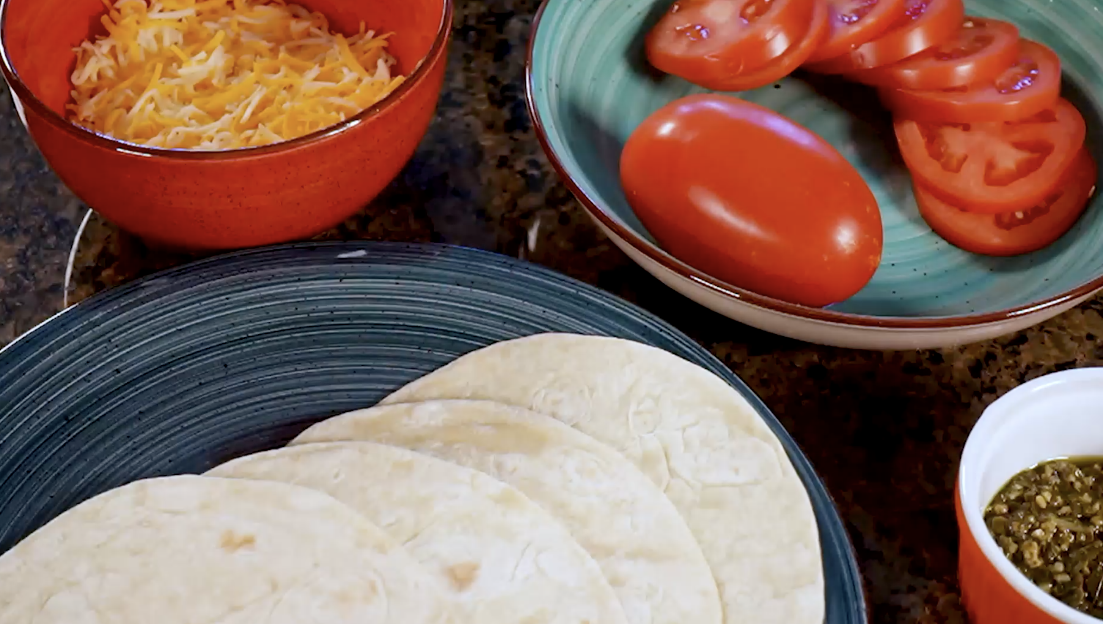 Try this pesto quesadilla recipe! Tortillas, roma tomatoes, shredded cheese, pesto…