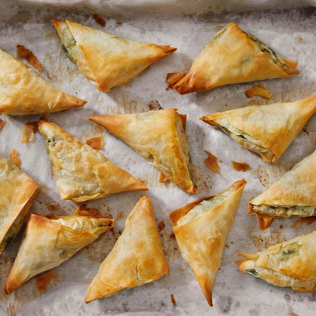 Spritz end of dough with spray and press onto triangle to seal. Turn triangle and spritz top with spray. Repeat with remaining phyllo and filling.