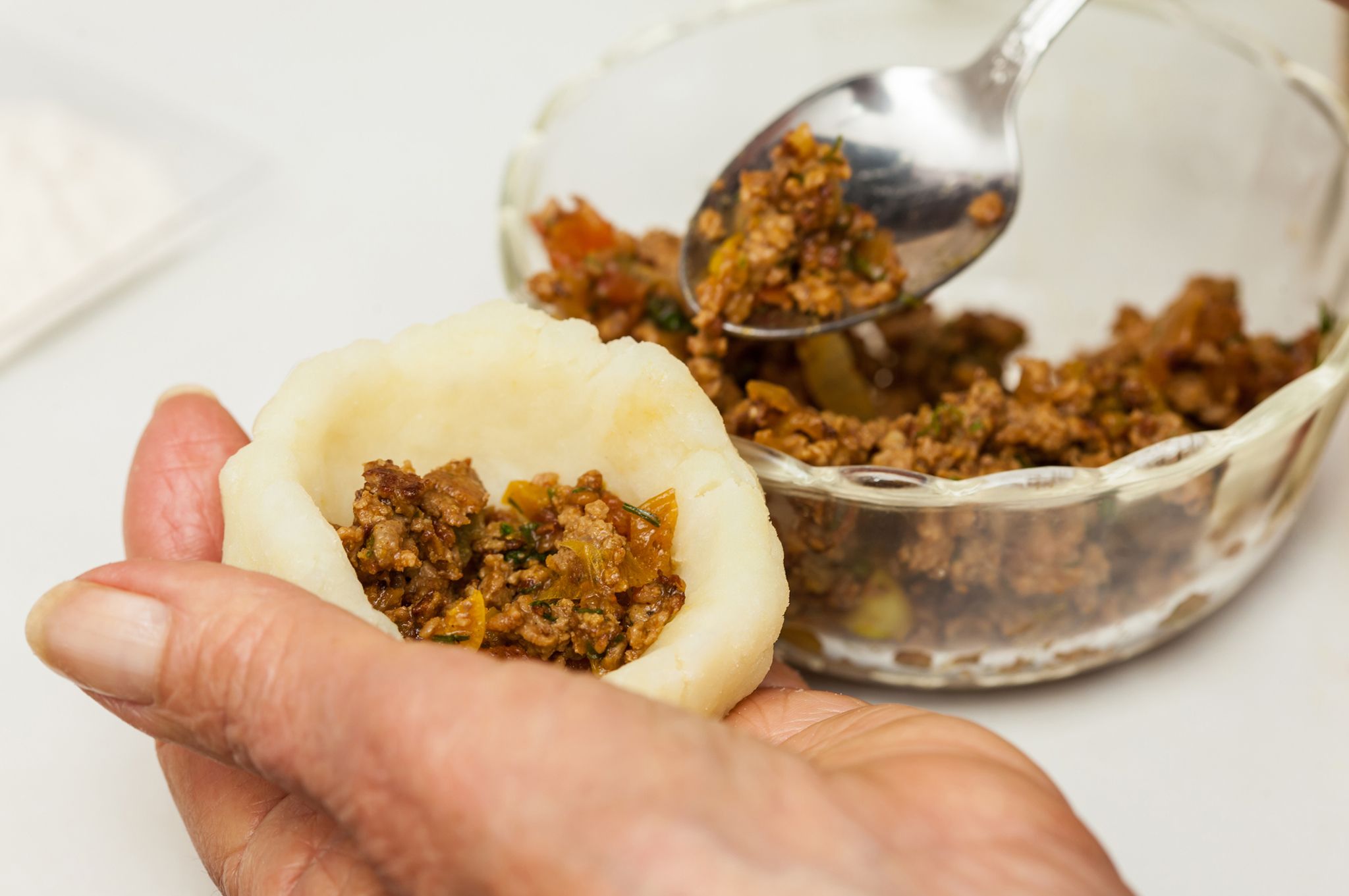 Pat out a small pancake of dough in your palm and place a few small pieces of meat in it. Roll it into a ball and seal the meat inside. Continue until you have made all the tamale balls.