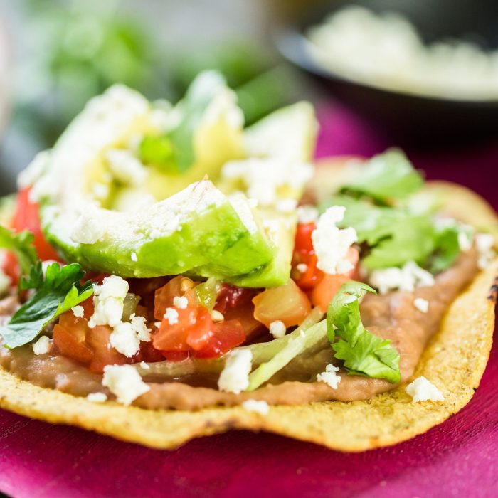 Assembling the tostadas: Top fried corn tortilla with the Creamer potatoes, black beans, scrambled tofu and yourn favourite toppings (cilantro, tomato, onion, avocado, hot sauce, etc.)